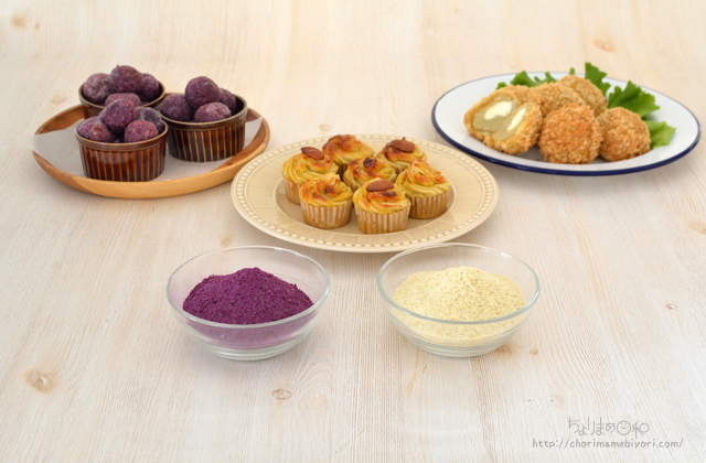 今回はノーマルさつまいもとキラキラの紫いもフレークの2種類で3品作ってみました。