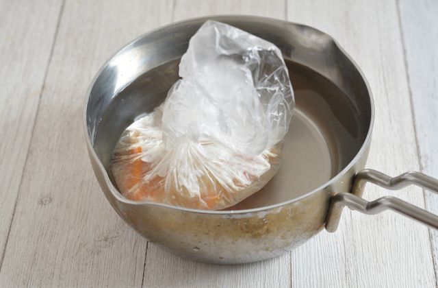 冷凍ストックしたスープストックは、湯せんで解凍あたためができる。