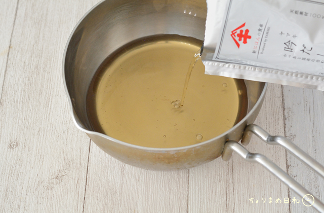 酒、しょうゆを吟だしに加えて煮立ったら、スープジャーにいれてゴールは目前。