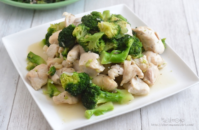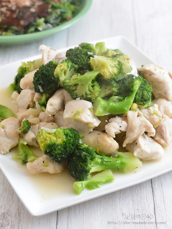 オリーブ油とにんにくで炒めて香りが立ったら、塩、こしょうをした鶏むね肉を入れて炒める。