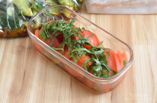 トマトは切って、大葉をのせて、オリーブ油、ゆずポンたらり。