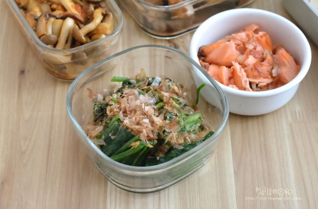 ほうれん草のお浸しと塩鮭のほぐし身。