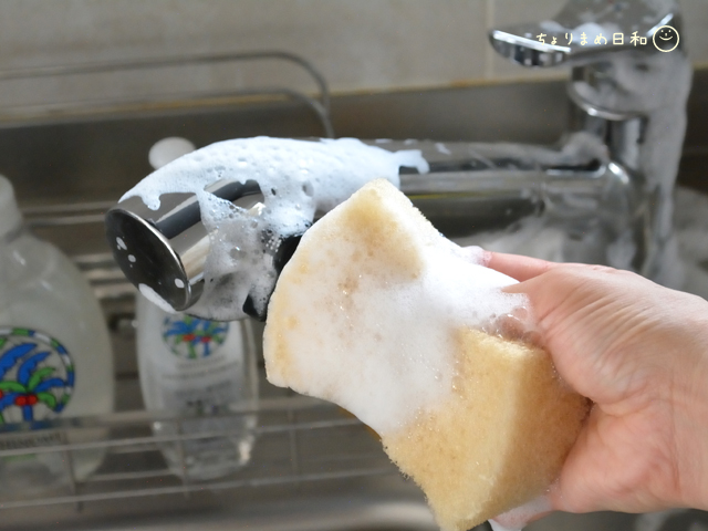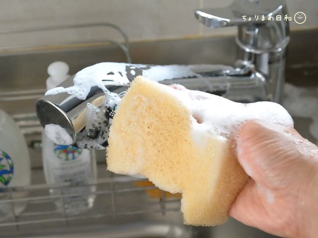 そこそこ使ったスポンジ(←大事w)に含ませると多からずな量で洗うことができます。
