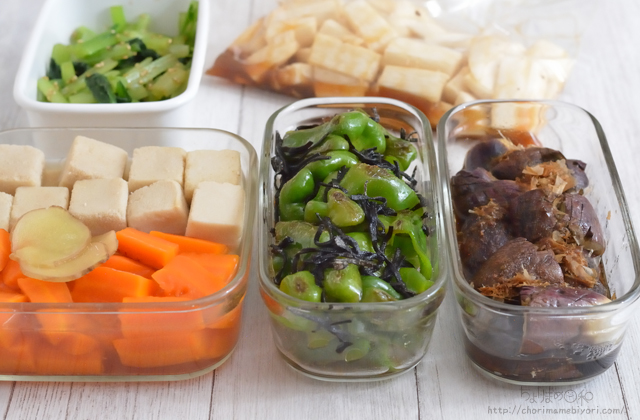 ちょりがスープランチ中なので、お弁当用の野菜おかずはもんちゃん用くらいかなの作り置き。