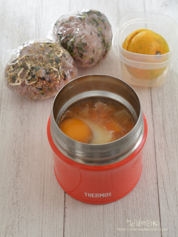 冷凍スープストックを温めて卵を落として、すぐさま蓋をしめる。