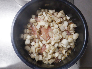 《下準備》 ・鶏肉は小さめに切る。 ・ごぼう、大根、にんじん、しいたけはさいの目に切る。 1.内なべに鶏肉、大根、にんじん、しいたけ、にんにく、ごま油を入れて和え、Aを加えて混ぜる。 2.本体にセットし、蓋をしめる。マニュアルを押して「圧力調理」に設定する。圧力値を「90」、決定を押して時間を「0:03(3分)」に設定する。スタートを押す。 3.加圧が終わり、圧力表示のピンが下がったら、ひと混ぜする。味が足りない場合は塩(分量外)で調える。
