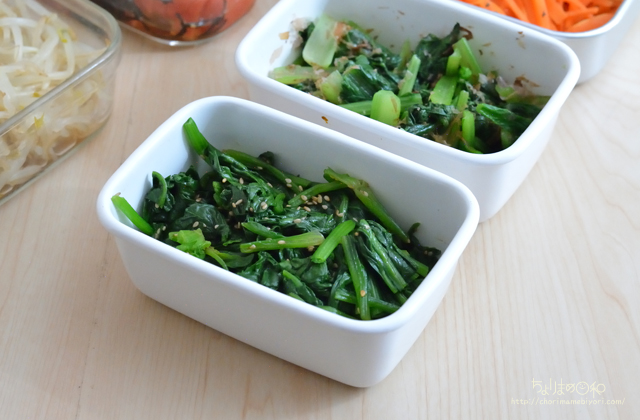 ほうれん草は塩ゆでして水でしめたら、ごま油、いりごま、塩で調味。