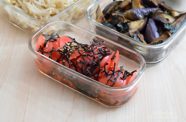 2.保存容器にトマトを入れ、塩昆布を散らす。