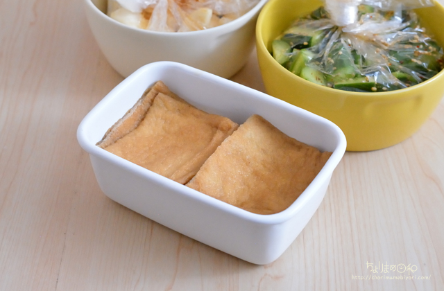 1.油揚げはキッチンペーパーに挟んで菜箸で転がす。熱湯をかけて油抜きする。