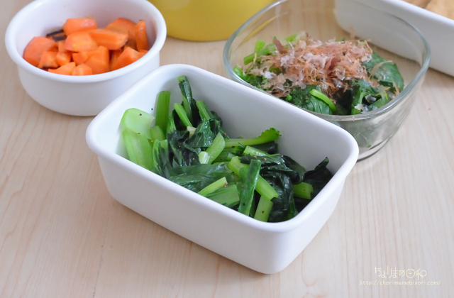 ほうれん草は塩ゆでして、かつお節トッピングのお浸し。