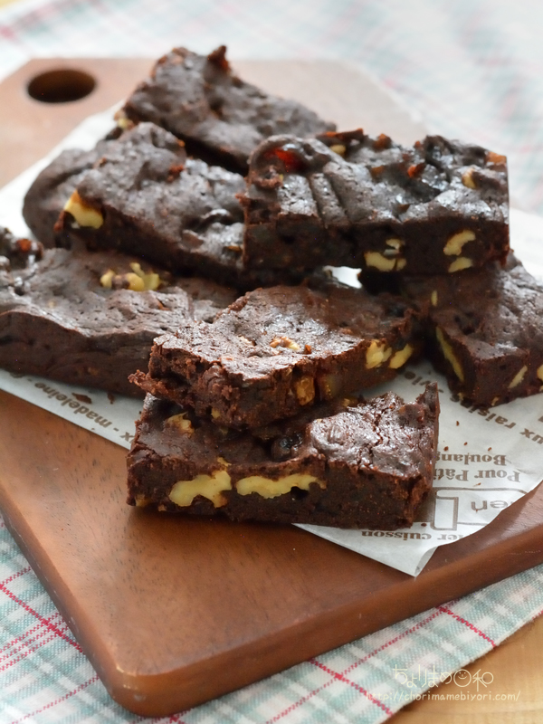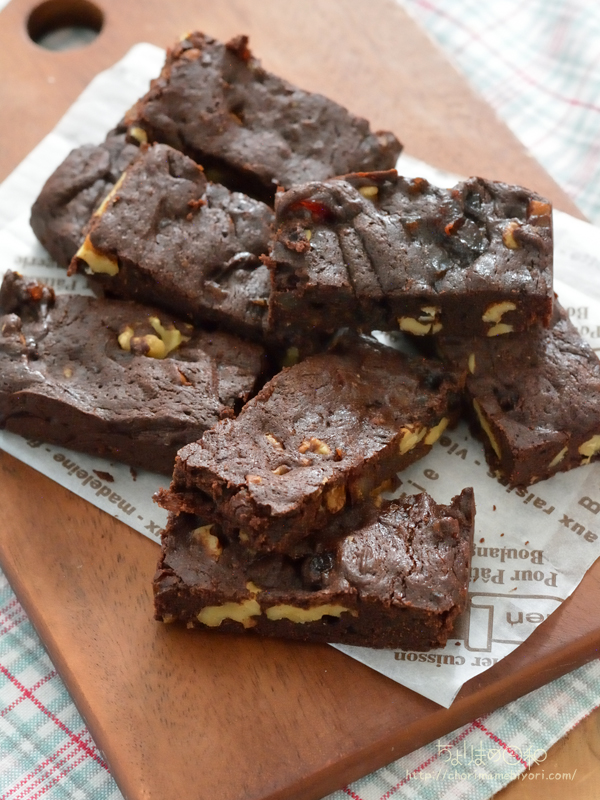 チョコブラウニーに洋酒漬けのドライミックスフルーツを入れて焼いたら、大人味になりました。