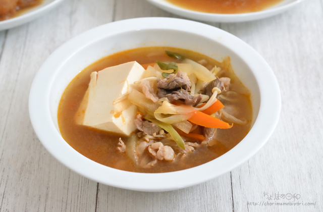 《下準備》 ・牛肉はひと口大に切る。 ・大根は皮をむき、拍子切りにする。 ・にんじんは細切りにする。 ・長ねぎは斜め切りにする。 ・えのきは石突を落として小房に分け、長さ半分に切る。 ・豆腐はひと口大に切る。 1.鍋ににんにく、豆板醤、ごま油を入れて中火で熱し、香りが立ったら大根、にんじんを入れて炒める。全体に油が回ったら、長ねぎ、えのきを入れて炒める。 2.全体に火が通ってきたら、酒、水、鶏がらスープの素を入れ、蓋をして5分ほど煮る。 3.牛肉、豆腐を入れて再沸騰したら、しょうゆを加えて調味する。