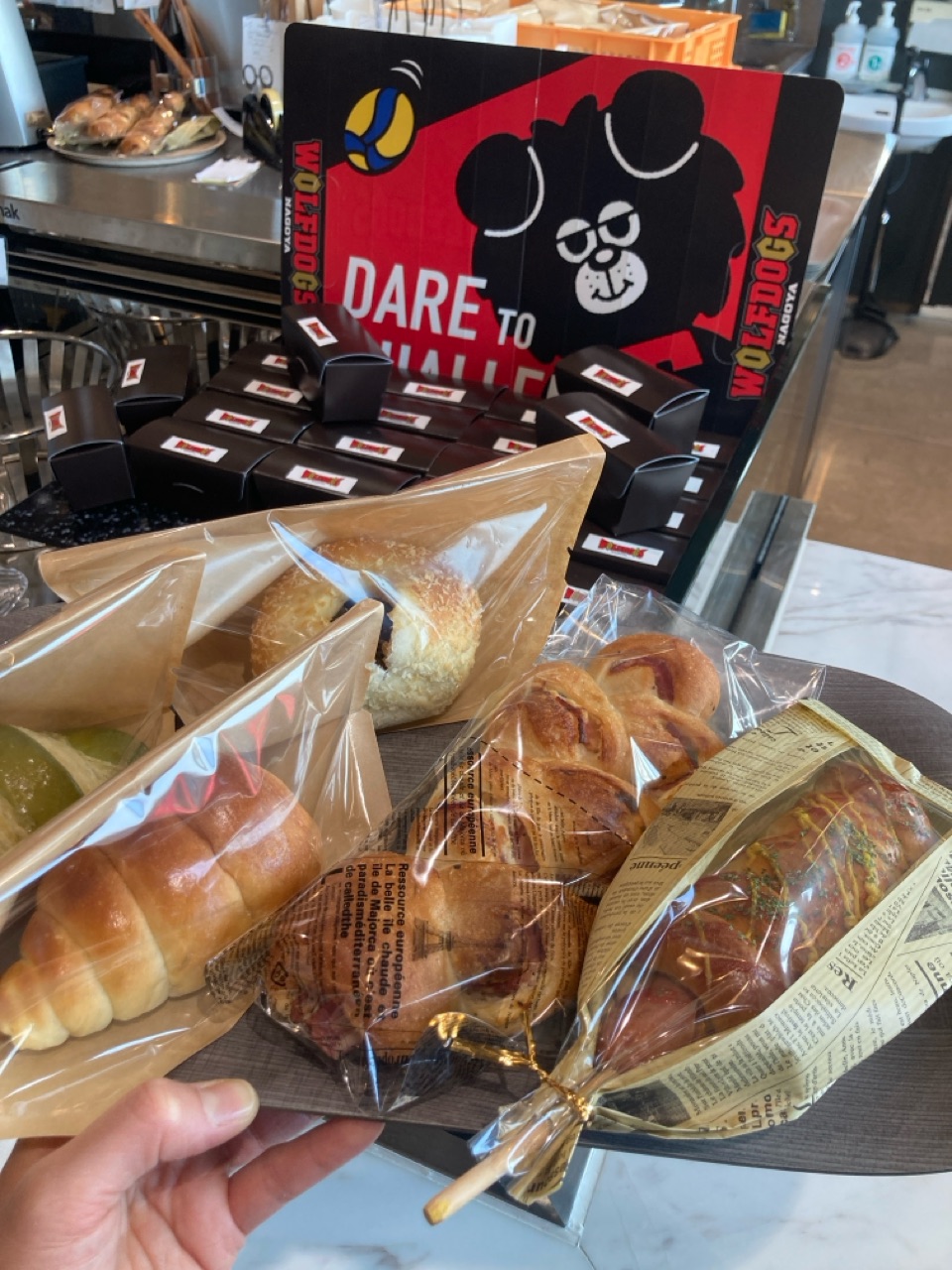 ベーコンエピ、ソーセージパン、カレーパン、チョココロネ、フラーリッサン(抹茶クロワッサン)。