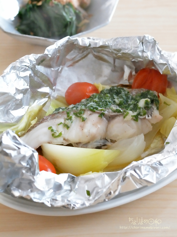 大葉、にんにくすりおろし、塩、オリーブ油のソースをかけてアルミホイルに包んでフライパン蒸し焼き。