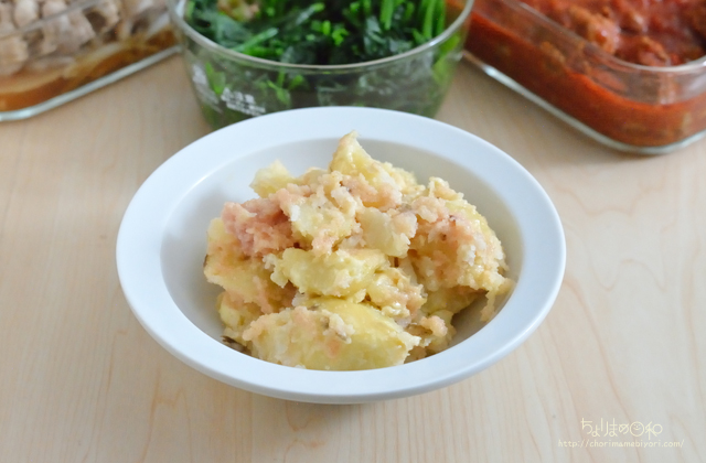 グリルパンで焼いたじゃがいもに明太子とマヨを控えめにして和えました。