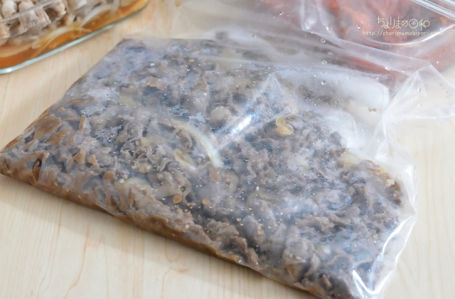 牛肉は、酒、オイスターソース、にんにく醤油、砂糖で調味。