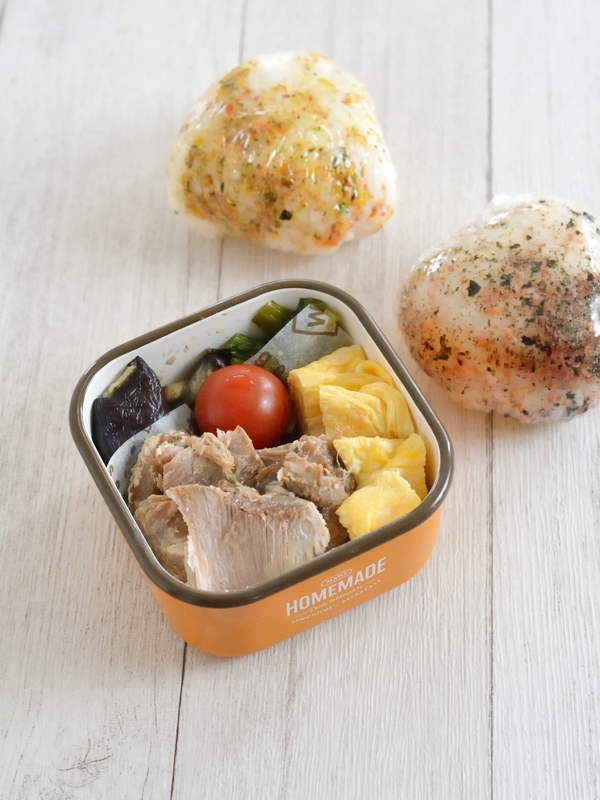 朝の支度も慣れないので、夜に作って冷蔵庫で入れておいて朝はおにぎり作るだけに。