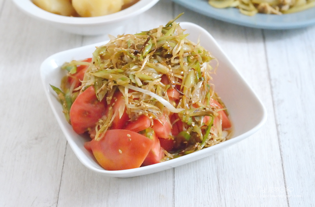香ばしく炒めたねぎとしょうゆ、酒で調味したものをトマトに乗せて完成。