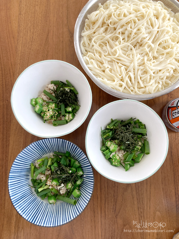 冷凍庫からストックしていた鶏そぼろをレンジで解凍してぶっかけ風にしました。