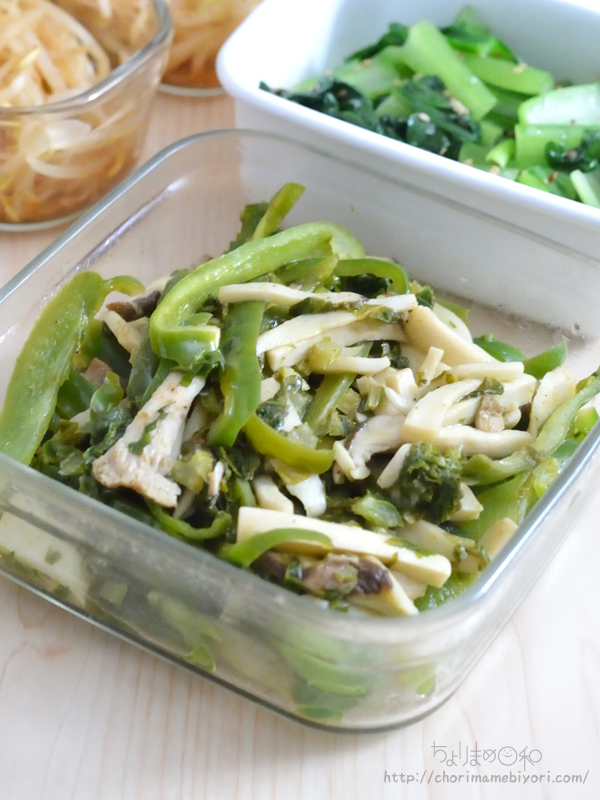 ピーマン、エリンギ、セロリの葉をオリーブ油で炒めて、塩、こしょう、レモン汁で調味。
