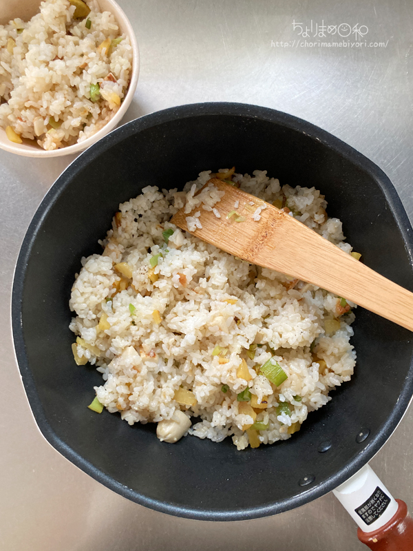 魚肉ソーセージとネギを炒めて、今回のポイントたくあんも炒める。