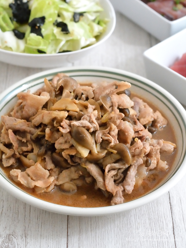 豚こまは、にんにくとしめじを一緒に炒めて、オイスターソース、しょうゆ、砂糖で調味。