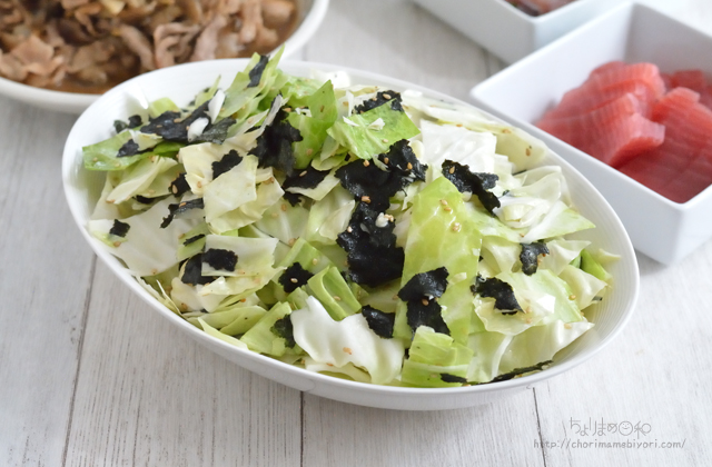 キャベツ、ごま油、塩、酢、いりごまを合わせて和える。