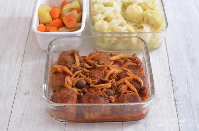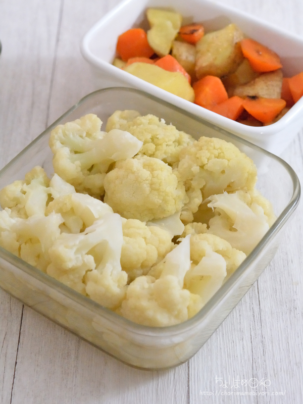 後ろのおかずは、オリーブ油、岩塩をふってグリルパンで蒸し焼きしたもの。