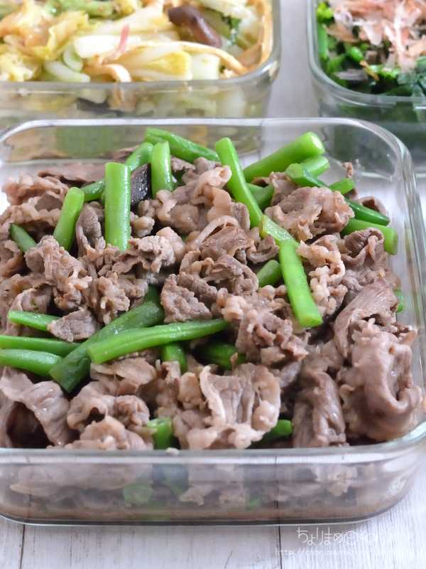 牛こま切れ肉、いんげんのオイスターソース炒め。