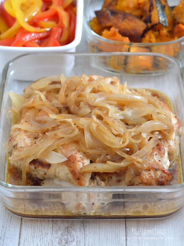 鶏むね肉にマヨネーズ、粗挽きコショウをからめて、玉ねぎと一緒に蒸し焼き。