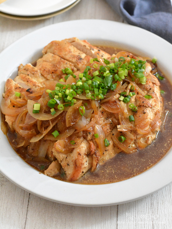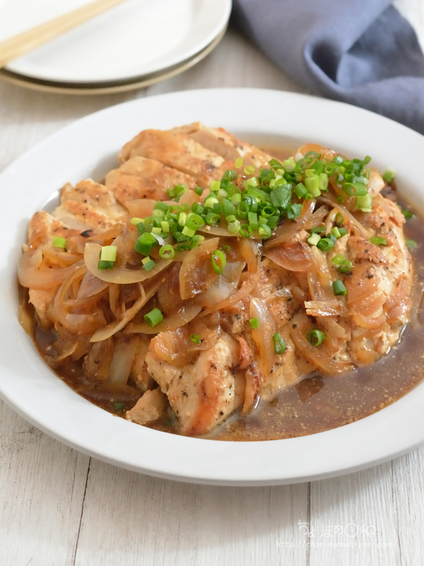 玉ねぎを一緒に蒸し焼きして、適度な水分が鶏肉の焦げ付きを緩和します。