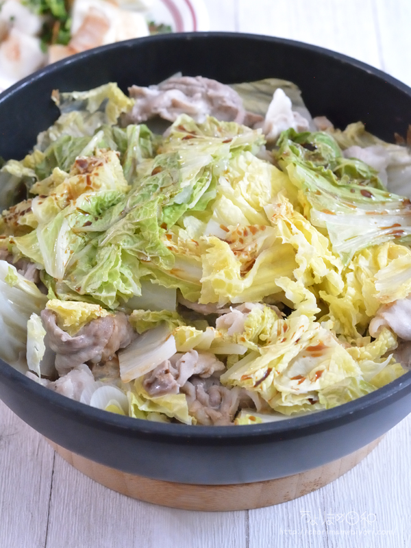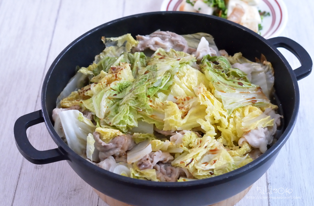 どっしりした白菜1/4カット、豚しゃぶ肉、そういえばの豚バラ肉を入れて塩、酒を回しかけて無水で調味。