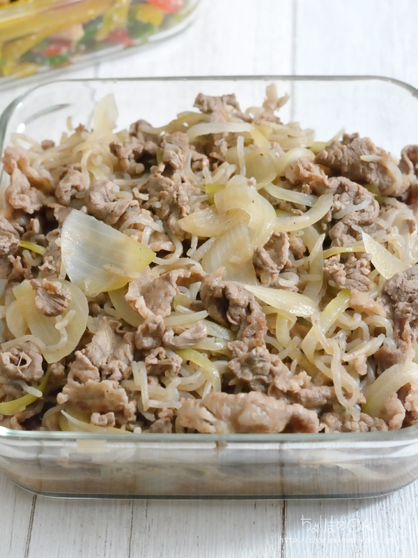 牛小間切れ肉、玉ねぎ、生芋しらたきで作った牛丼の具。