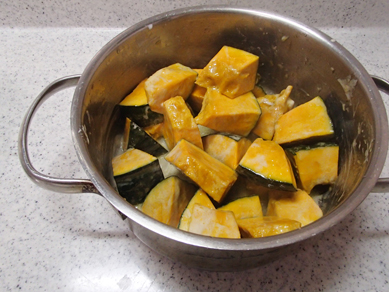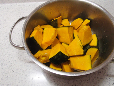 ・かぼちゃは、ひと口大に切る。