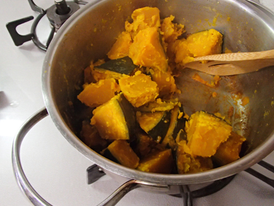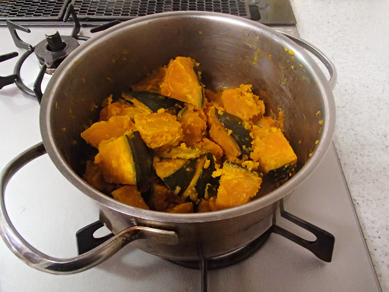 1.鍋にかぼちゃ、塩を合わせ、鍋をふって塩を全体に行き渡たらせる。