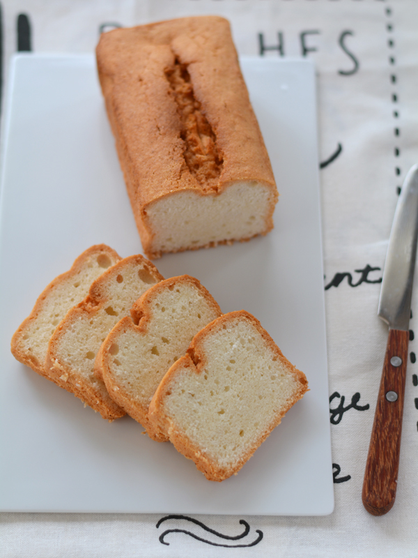 見た目はパウンドケーキ。切ってみると驚きの純白さです。油脂も「純白ごま油」を使って白。卵も卵白のみを使って白。白でまとめた簡単ケーキです。味も驚きの☆☆☆!