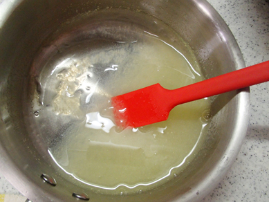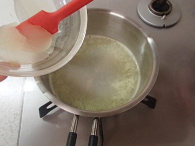 4.【3】を火にかけてフツフツとしたら、Aを加えて溶かて氷水などにあてながら冷やす。