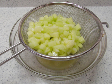 2.メロンの果肉はさいの目に切り、切ったときに出た汁気とともに、【1】のざるに入れて余分な果汁を出す。