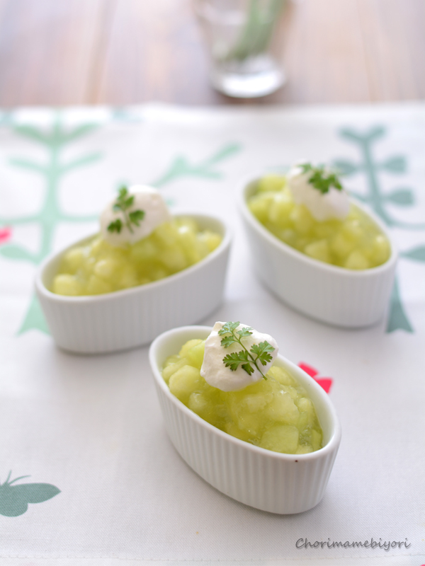 5.【4】にとろみがついてきたら、メロンを加えて混ぜて器の入れ、お好みでホイップクリームとチャービルを飾る。