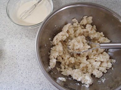 2.じゃがいもの皮をむいてマッシャーでつぶし、おから、塩を加えてしっかりとつぶし混ぜる。