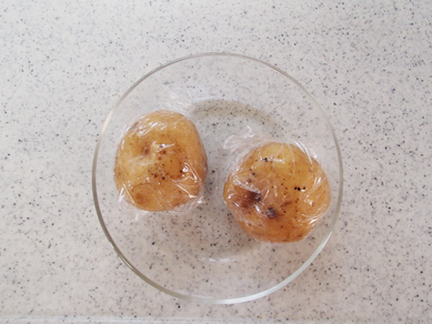 じゃがいものレンジ加熱は水にくぐらせてからピッタリとラップをしてから。