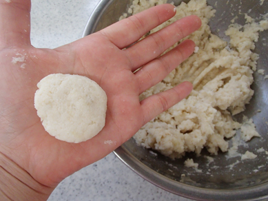 3.混ぜ合わせたAを加えて混ぜ、一口大に丸めて平らにする。