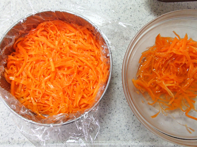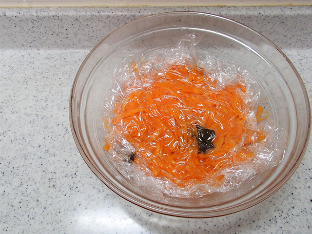 にんじんは千切りにし、塩をふって5分ほどおく。汗をかいたらしんなりするまでもみ、流水にで洗う。