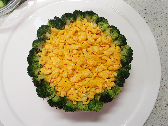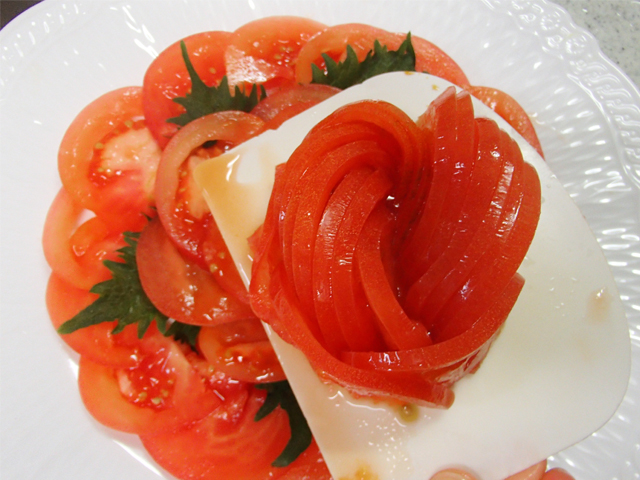 ミニトマト、【3】塩ゆでブロッコリーを飾る。