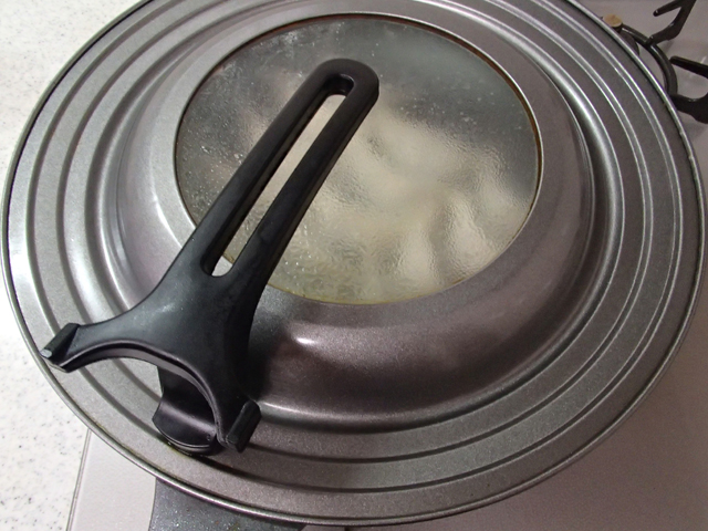 6.水(50ml程度)を全体に回しかけて蓋をして強火のまま、焼き音が小さくなるまで蒸し焼きにする。