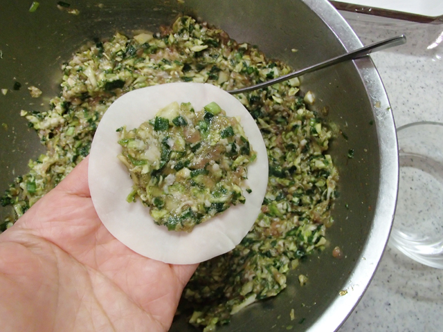 4.餃子の皮に【3】のタネを塗るように広げ、ふちに水をつけてひだをつけて閉じる。手でにぎるように形を整える。