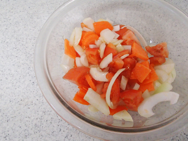 1.耐熱ボウルににんじん、玉ねぎ、トマト、にんにく、オリーブ油、塩を入れてひと混ぜする。