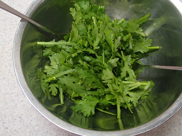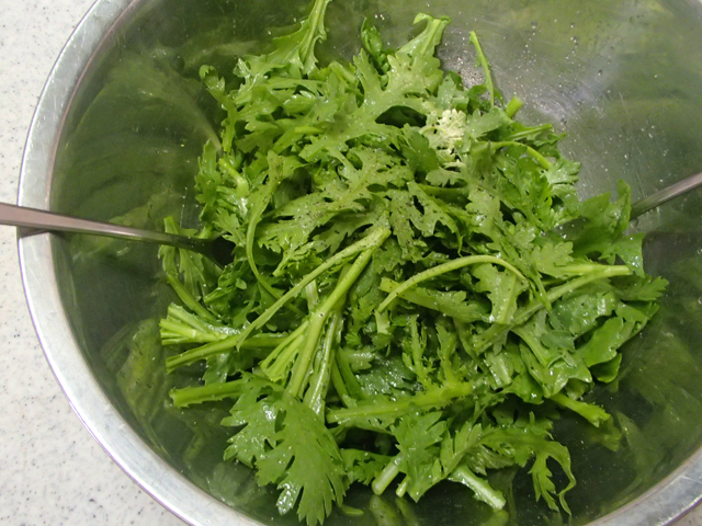 1.ボウルに春菊、オリーブ油を回しかけて油が全体に行き渡るようにざっくりと混ぜる。