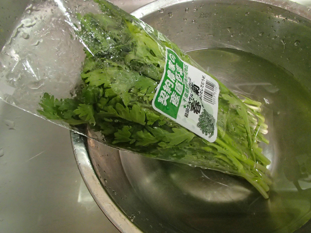 ※春菊の袋に水を入れて洗い、水の中に立てて10分ほどおき、水気をきりながら茎から水を吸わせてシャキっとさせておきます。袋の底は穴があいていることが多いので横から余分な水が抜けていきます。