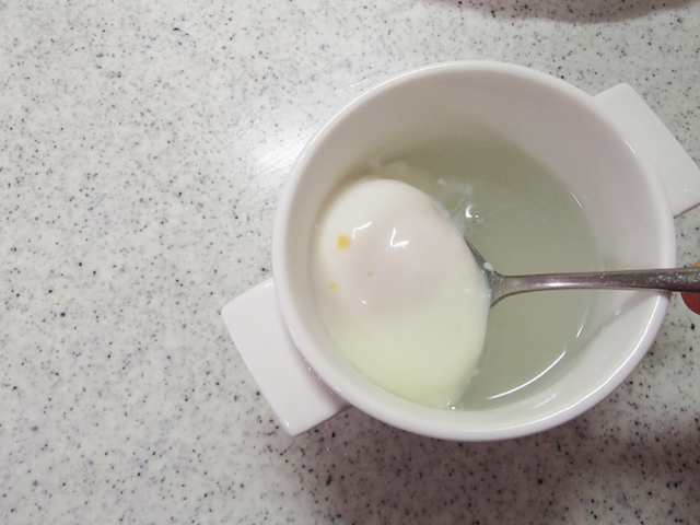 電子レンジの場合➡深めの器に水を少量入れてから卵を優しく割り入れる。爪楊枝で卵黄を2~3か所刺し、卵がかぶるくらいまで水を注ぐ。レンジ500Wで1分20~30秒加熱し、上下返してしばらくおく。